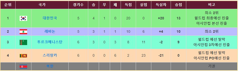 대한민국과 레바논의 마지막 경기에서 대한민국이 진다 하여도 승점 13점 동률에 득실차 때문에 대한민국이 조 1위로 진출할 가망성이 매우 높은 상황입니다.